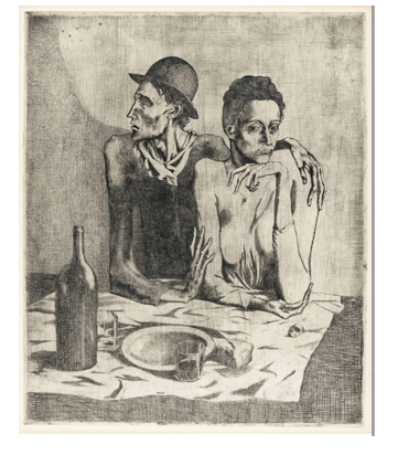 Pablo Picasso. La comida frugal. París,1904. Museo de la Real Academia de Bellas Artes de San Fernando. Madrid. Fuente: Dossier de prensa. Picasso, Rostros y Figuras. Obras de la Fondacion Beyeler y de la Real Academia de Bellas Artes de San Fernando.