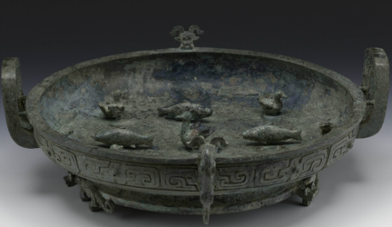 Se trata de un recipiente circular, con asas (características del periodo Zhou) de gran tamaño y escasa profundidad; realizado en bronce. Presenta un pie anular soportado por elementos animalísticos en forma de tigres o dragones, e interior repleto de una colección de peces, ranas y patos tallados en decoraciones aplicadas, habitando un espacio que simula una charca, a cuyo borde asoman las cabezas de otros dos dragoncitos que se aúpan al extremo del recipiente para contemplar la escena.